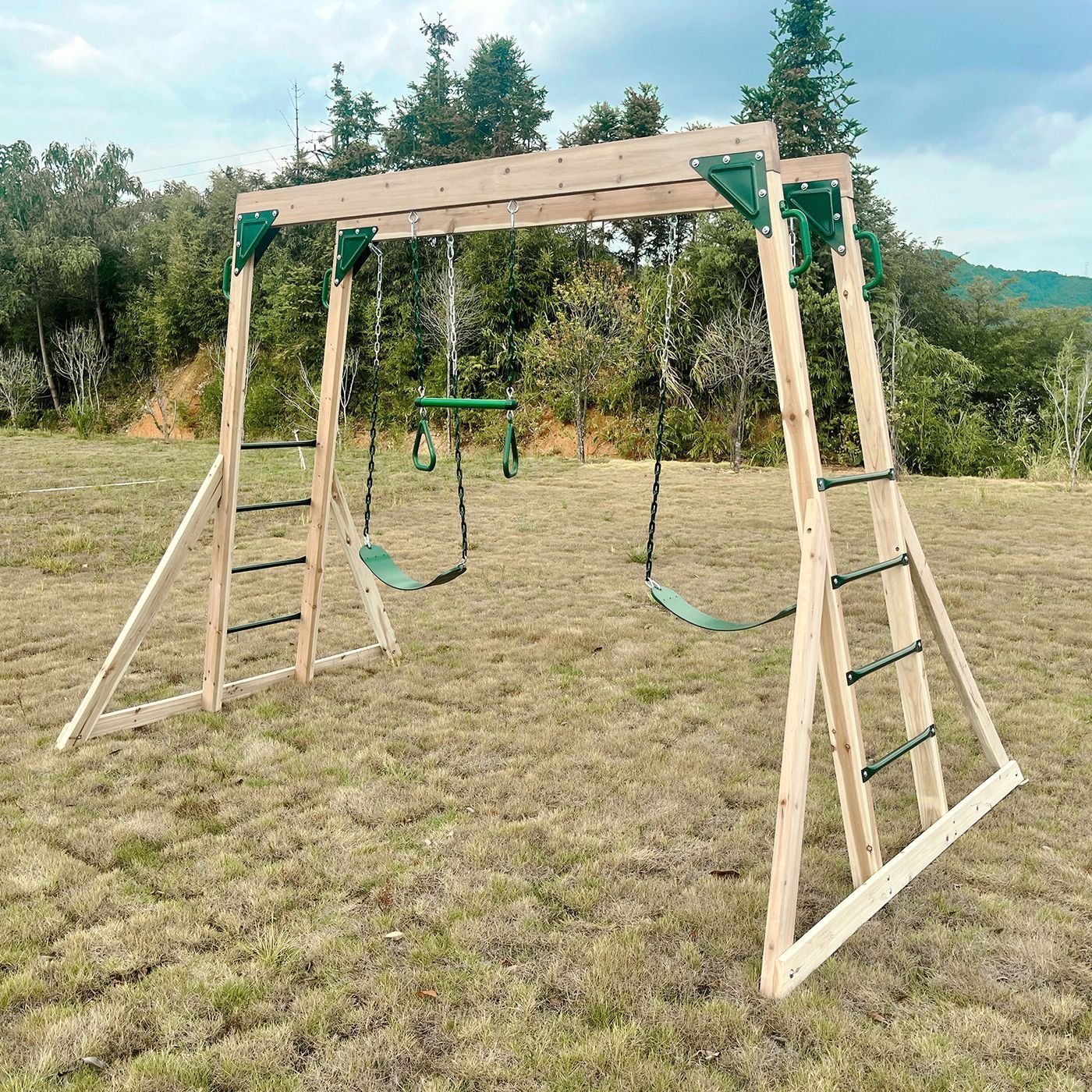 - Includes 2 Green Belt Swings and Trapeze/Acrobat Swing
