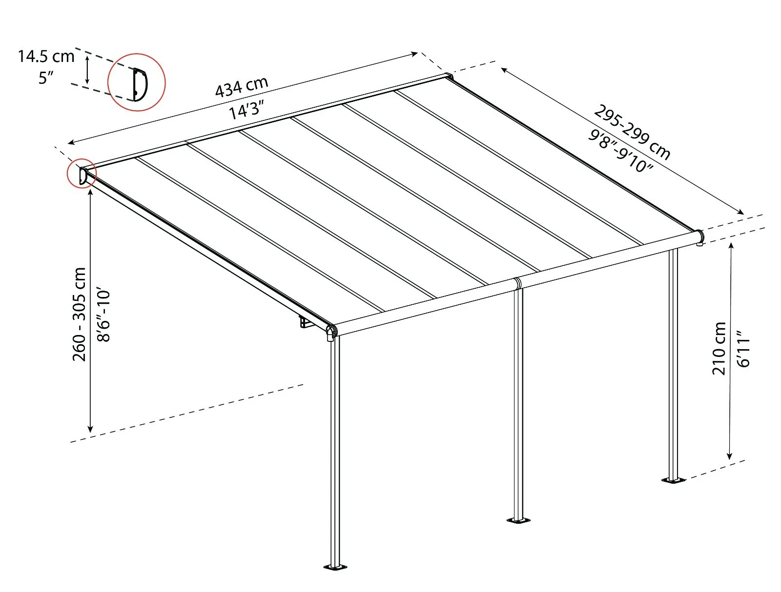 Adjustable front support poles allow accommodation of various patio heights and door clearances. -